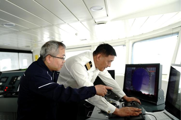 4月20日,“同济”号南海春季航次首席科学家田军教授(左)和“同济”号船长石斌(右)商量考察站位工作。新华社记者 张建松 摄