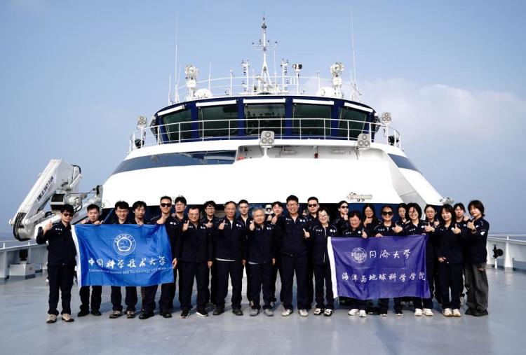 4月19日,来自同济大学和中国科学技术大学的考察队员在“同济”号合影。新华社记者 张建松 摄