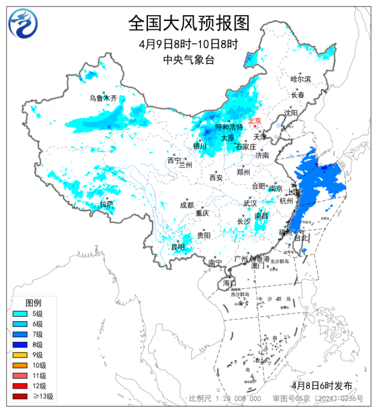 预计,4月8日08时至9日08时,新疆东部和南疆盆地、内蒙古、甘肃东部、宁夏北部、吉林中西部、辽宁北部以及西藏大部、川西高原、云南、贵州等地部分地区有5~7级风,阵风8~9级;黄海中部和南部海域、东海西北部海域有7级风,阵风8级。