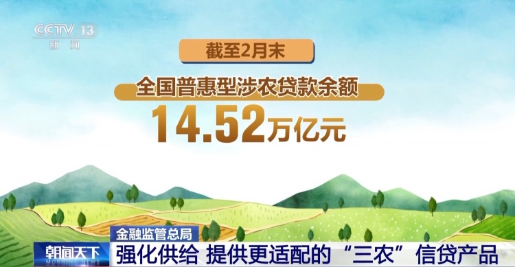 截至2月末,全国普惠型涉农贷款余额14.52万亿元,同比增长10.34%;1—2月,农业保险为2100万户次农户提供风险保障0.9万亿元,有效支持了农业生产。