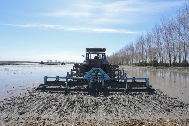 这是4月9日拍摄的黑龙江北大荒农业股份有限公司友谊分公司水稻田整地作业现场(无人机照片)。新华社记者王松 摄
