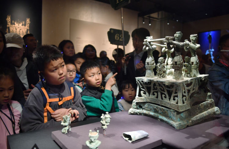 4月3日,小朋友在三星堆博物馆观看展品。新华社记者 卢哲 摄