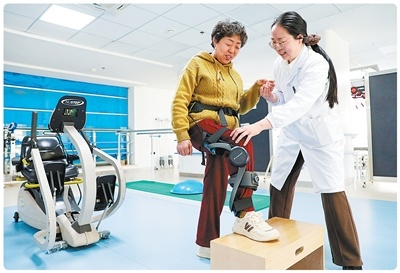 4月7日,江苏省海安市中医院康复训练中心,患者正在治疗师指导下穿戴外骨骼机器人进行康复训练。