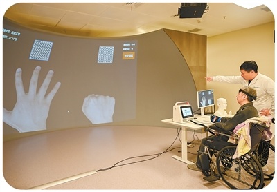 4月7日,贵州省贵阳市,北京积水潭医院贵州医院医生在指导患者进行脑机接口康复训练。