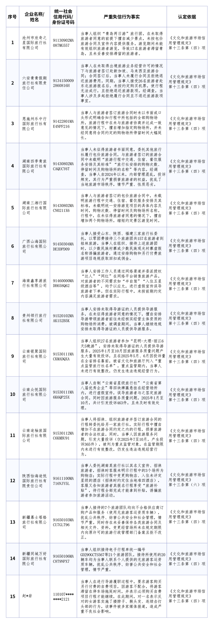 旅游市场秩序集中整治工作开展以来,各地依法查办了一批重大案件,并依法依规开展失信主体认定,截至2026年3月底,全国文化和旅游市场共认定失信主体1655个。为落实《国务院办公厅关于进一步加强旅游市场综合监管的通知》有关要求,提升信用监管效能,营造诚信、公平、有序的旅游市场环境,现对旅游市场秩序集中整治严重失信主体典型名单(2026年第一批)予以公布。