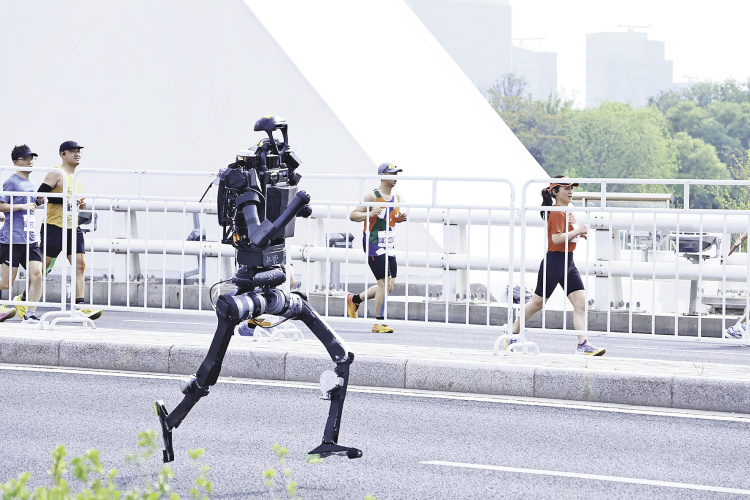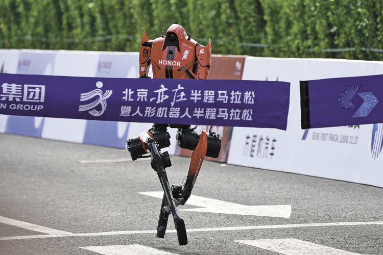 《环球时报》记者在现场发现,本场赛事采用人机分赛道并行,人类跑者在一侧赛道挥汗如雨,机器人则迈着精准的步伐在另一侧赛道逐风前行。不同于直播画面中略显平缓的节奏,今年的比赛,给人一个最直观的感受就是:机器人跑得真快!与人类跑者的激情澎湃不同,机器人赛队的表现更显“硬核”与温情。当天的比赛人机分赛道并行,人类跑者凭借耐力与毅力挑战自我,机器人则依靠精准的算法与强劲的硬件逐鹿赛场。