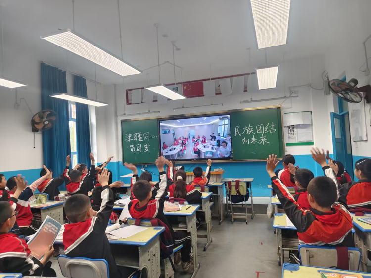 “同学们,今天我们的教室打开了一扇‘魔法窗’——推开它,就能看见3200公里外的天津。”随着谢依特小学支教教师、天津师范大学西部计划志愿者郭正媛充满童趣的引导,屏幕两端的师生瞬间打破时空界限。天津会场的马克思主义学院学生理论宣讲团成员与边疆小学的学生实时互动,天山脚下的课堂与渤海之滨的校园通过网络紧紧相连。