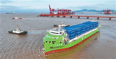 东海之滨,海天一色。4月15日16时,浙江宁波舟山港北仑第一集装箱码头公司7号泊位,一艘印有“宁远电鲲”字样的集装箱货轮缓缓驶离,驶向浙江嘉兴港乍浦港区。