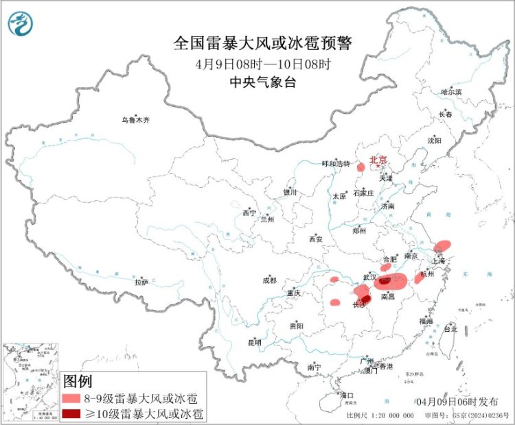 预计4月9日08时至10日08时,江汉东部、江南北部等地的部分地区将有8级以上雷暴大风或冰雹天气,其中,湖北东南部、江西北部、湖南东北部等地的部分地区将有10级以上雷暴大风,最大风力可达11级以上,局地不排除出现龙卷的可能性;江汉、江淮南部、江南北部等地的部分地区将有小时雨量大于20毫米的短时强降水天气,其中,江西北部等地局地小时雨量大于50毫米。