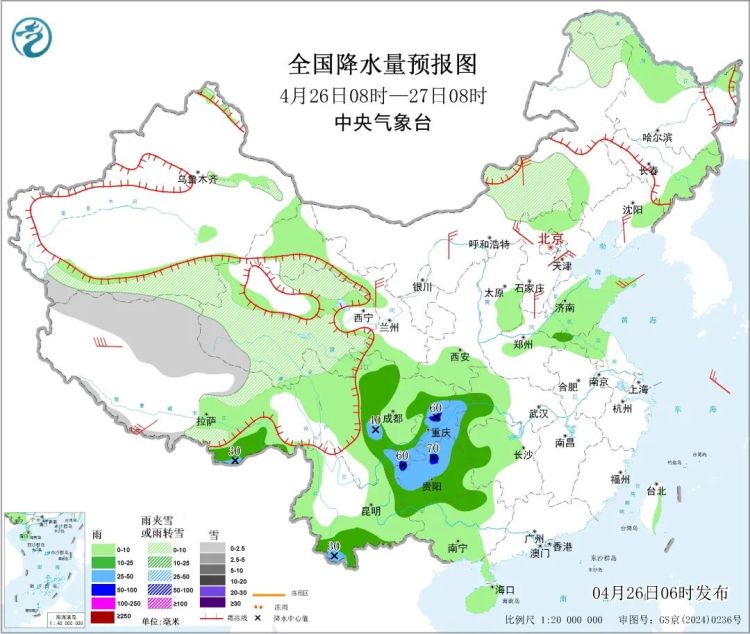 其中,今天白天至夜间,四川中东部、重庆、贵州、云南南部、西藏东南部等地部分地区有中到大雨,四川盆地东北部、重庆中部和南部、贵州北部、云南东北部等地部分地区有暴雨(50至70毫米)。