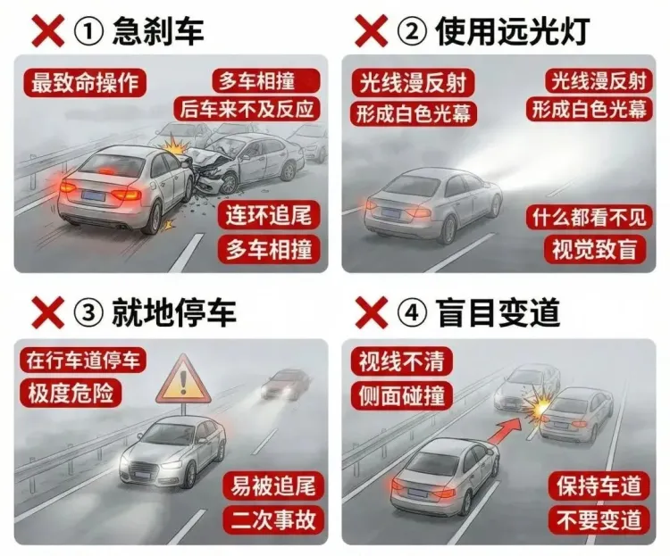 雨天视野受限,驾驶员对前方及周边路况、车辆等判断受到很大影响。因此,在恶劣天气下,最重要的就是“降低车速、加大车距”,尤其在高速公路上,还要根据实际路况和雨势,严格遵守车速、车距规定。