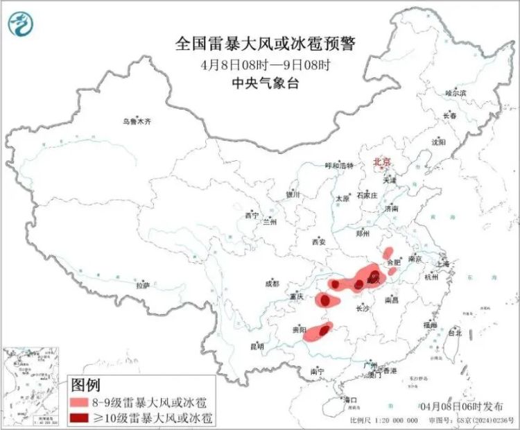 同时,江汉、江淮西部、江南北部、西南地区东部等地的部分地区将有8级以上雷暴大风或冰雹天气,其中,湖北东部和南部、湖南西部、重庆东南部、贵州东南部等地的部分地区将有10级以上雷暴大风,最大风力可达11级以上。