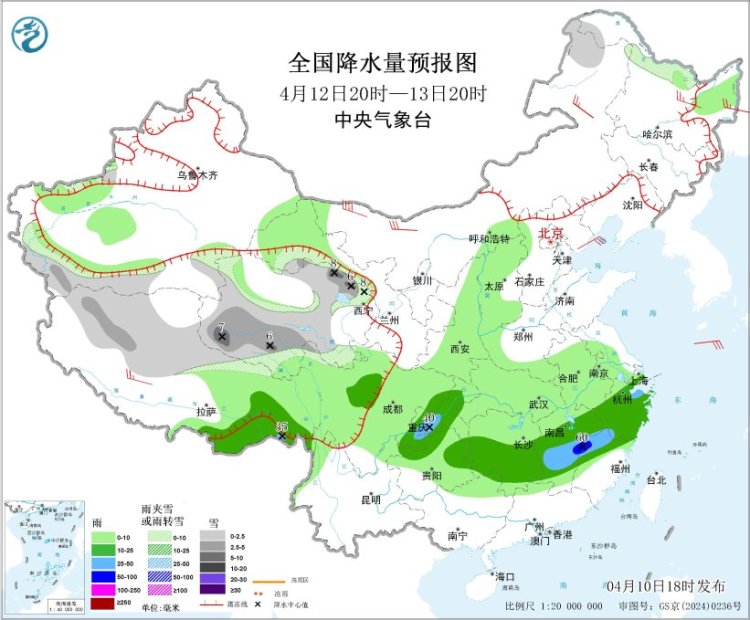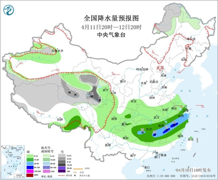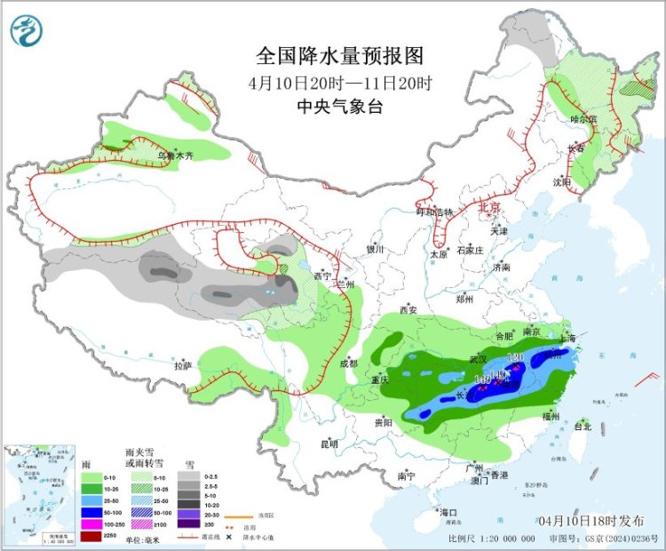 4月10日20时至11日20时,内蒙古东北部、东北地区东部和北部、新疆沿天山地区、西藏北部和西部、青海南部和东部等地部分地区有小到中雪或雨夹雪,其中,黑龙江中部、西藏北部、青海南部和东部等地部分地区有大雪。江淮西部、江汉南部、江南大部、西南地区东南部等地部分地区有中到大雨,其中,湖南中部、江西中北部、浙江中北部等地部分地区有暴雨或大暴雨(100~140毫米)。内蒙古东南部、新疆北疆东部、甘肃河西等地部分地区有4~6级风,其中,新疆东部部分地区有6~7级风(见图3)。