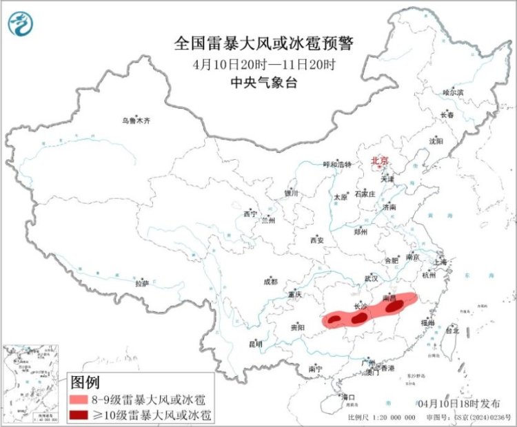 预计,4月10日20时至11日20时,湖南中东部和西南部、湖北东南部、江西中北部、安徽南部、浙江中西部和北部、福建西北部及重庆东部、贵州东部等地部分地区有大到暴雨,其中,江西中北部等地局地有大暴雨(100~140毫米)(见图1);江南中西部等地的部分地区将有8级以上雷暴大风或冰雹天气,其中,湖南南部、江西中部等地的部分地区将有10级以上雷暴大风,最大风力可达11级以上;江南中部等地的部分地区将有小时雨量大于20毫米的短时强降水天气,其中,湖南南部、江西东北部、福建西北部等地的部分地区小时雨量大于50毫米(见图2)。中央气象台4月10日18时继续发布暴雨蓝色和强对流天气蓝色预警。