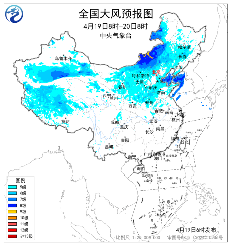 预计今天白天到夜间,新疆东部和南疆盆地、内蒙古大部、山西、河北大部、北京西部和北部、天津、山东西部和北部、河南中北部、黑龙江西部和南部、吉林中西部、辽宁中西部、宁夏、陕西中北部、甘肃北部、青海北部、西藏中西部等地部分地区有5至7级风,阵风8至9级,其中,新疆东部山口地区和南疆盆地东部、内蒙古中部、河北南部、河南中北部局地有8至9级风,阵风10级以上。中央气象台4月19日06时继续发布大风黄色预警。