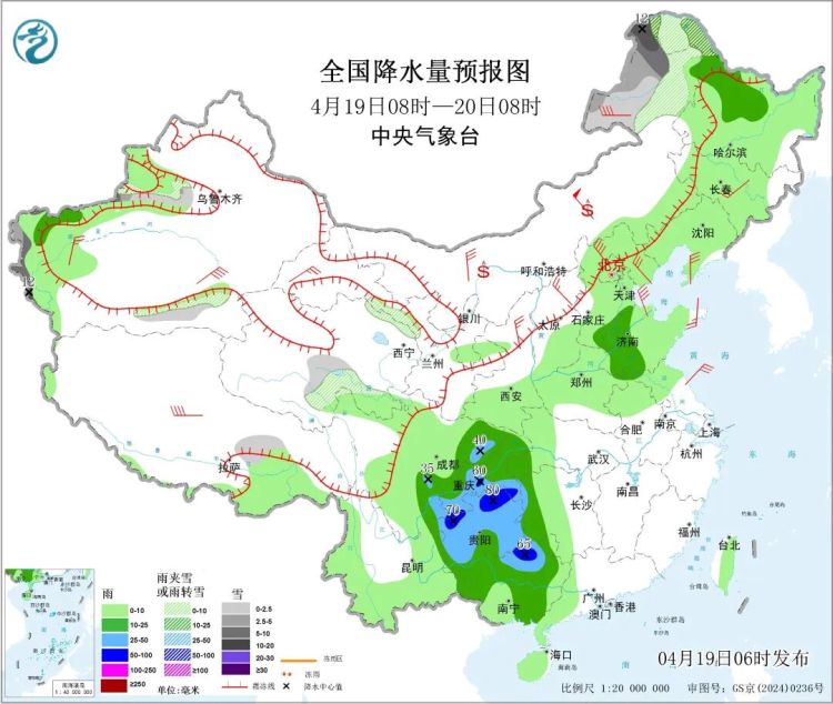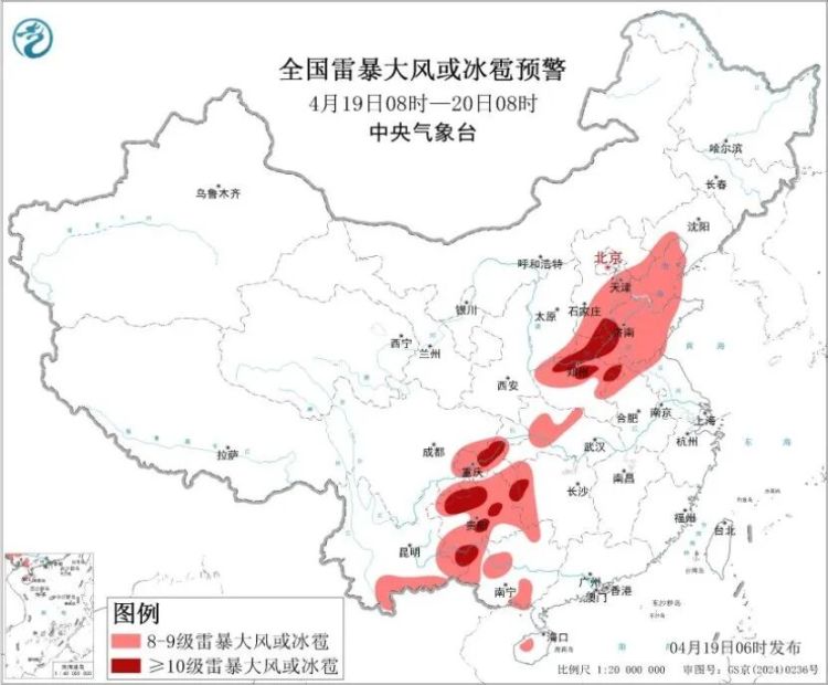 华北南部、黄淮中西部、西南地区东部和南部、华南西部等地的部分地区将有小时雨量大于20毫米的短时强降水天气,其中,重庆中西部、贵州西部和北部、广西西部和南部沿海等地的部分地区小时雨量大于50毫米,最大可达60毫米以上。强对流的主要影响时段为今天午后至夜间。中央气象台4月19日06时继续发布强对流天气蓝色预警。