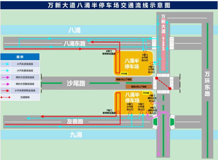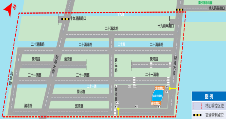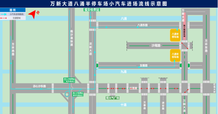 公安交管部门将视实际交通情况加强大湾区文化体育中心、万新大道八涌半停车场、万顷沙地铁站周边区域道路的交通管控,并对虹霞大道、万环西路、新港大道、灵新大道、红莲路、万新大道、同安东围路等路段实施临时管控分流,沿线严禁路侧停放车辆,请过往车辆按照现场民警、管理人员指挥和交通标志指示通行,非必要请勿前往。
