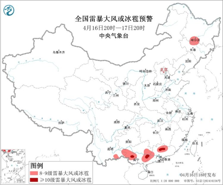 预计4月16日20时至17日20时,华南和东北地区中部等地的部分地区将有8级以上雷暴大风或冰雹天气,其中,广西西部和东部、广东北部等地的部分地区将有10级以上雷暴大风;华南等地的部分地区将有小时雨量大于20毫米的短时强降水天气,其中,广西西部、广东北部等地的部分地区小时雨量大于50毫米。