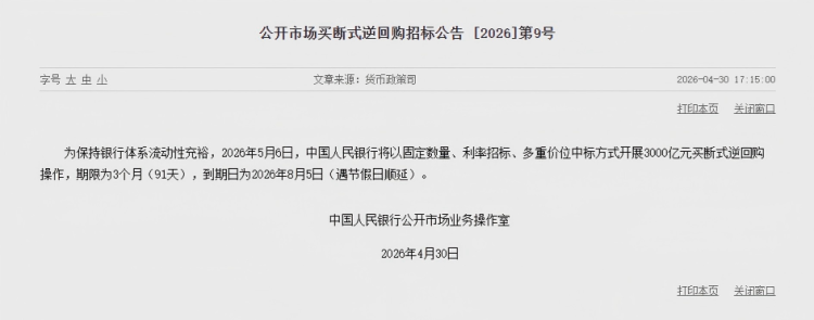 中国人民银行官网今天发布消息,为保持银行体系流动性充裕,2026年5月6日,中国人民银行将以固定数量、利率招标、多重价位中标方式开展3000亿元买断式逆回购操作,期限为3个月(91天),到期日为202