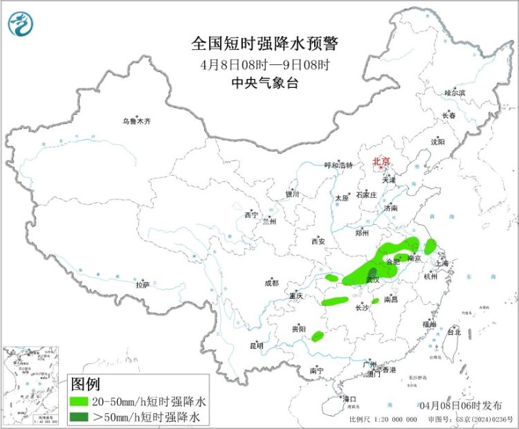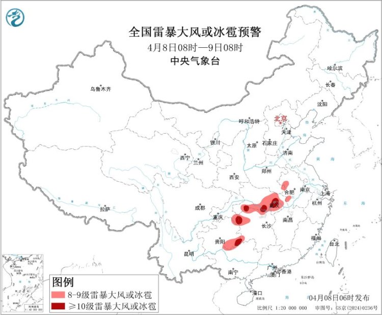 预计4月8日08时至9日08时,江汉、江淮西部、江南北部、西南地区东部等地的部分地区将有8级以上雷暴大风或冰雹天气,其中,湖北东部和南部、湖南西部、重庆东南部、贵州东南部等地的部分地区将有10级以上雷暴大风,最大风力可达11级以上;湖北东部和南部、安徽中北部、江苏中部、河南南部、湖南北部等地的部分地区将有小时雨量大于20毫米的短时强降水天气,其中,湖北东部局地小时雨量大于50毫米。