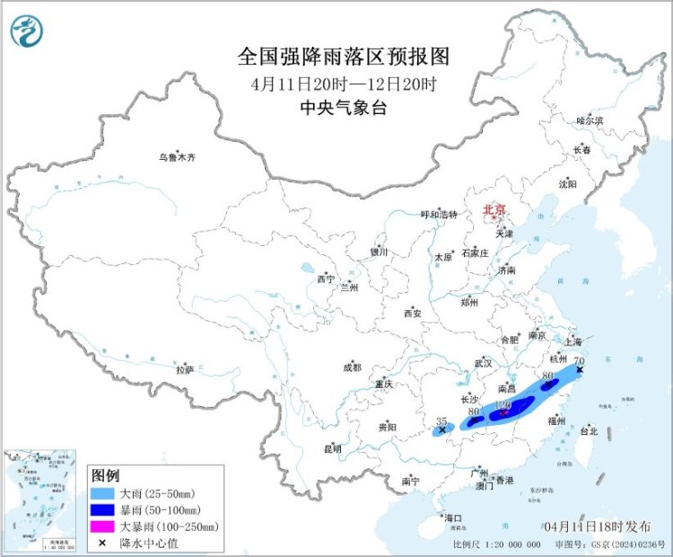 预计,4月11日20时至12日20时,浙江南部、江西中南部、福建西北部、湖南南部、广西东北部等地部分地区有大到暴雨,其中,江西中部等地局地有大暴雨(100~120毫米)。上述部分地区伴有短时强降水(最大小时降雨量20~40毫米,局地可超过50毫米),局地有雷暴大风或冰雹等强对流天气。