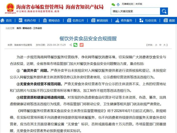 《网络餐饮服务经营者落实食品安全主体责任监督管理规定》将于2026年6月1日起正式施行。新规明确,在实际经营场所既不向消费者持续提供现场就餐服务,也不向消费者持续提供自提服务无堂食外卖经营者,应当在其主页面显著位置设置“无堂食”标识,否则或面临最高十万元罚款。市场监管部门郑重提醒,无堂食外卖经营者务必按新规要求如实标识。