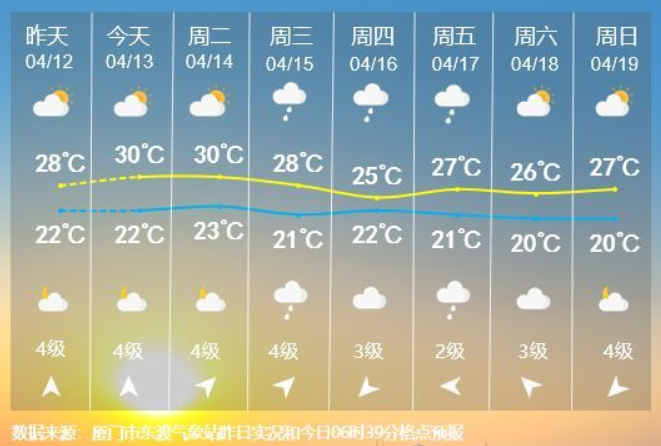 届时,厦门天气由多云转为阴天,伴有雷阵雨,北风渐起,城区最高气温回落至28℃。