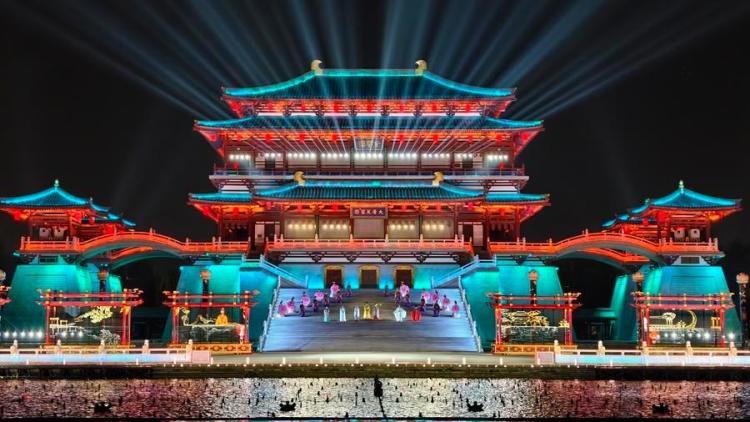 天色渐晚,创新的舞台升向夜空。清明假期,西安大唐芙蓉园300亩湖面上,20米水幕再次升起,裸眼3D投影点亮紫云楼。大型沉浸式水舞光影秀《大唐追梦》焕新上演,游客登上仿唐画舫,在《将进酒》的吟诵中穿越盛唐诗篇。