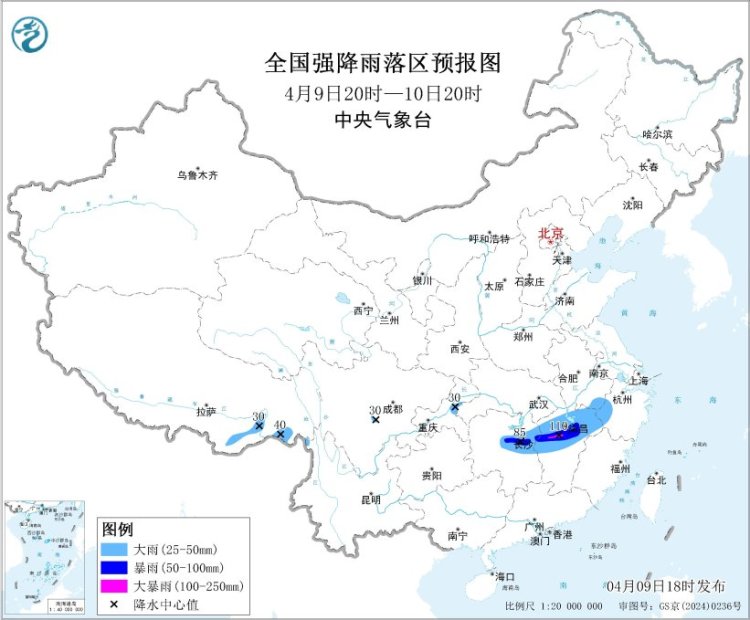 预计,4月9日20时至10日20时,西藏东南部、四川中部、重庆东部、安徽南部、湖南东部、江西中北部、浙江西部等地部分地区有大到暴雨,其中,江西中部等地部分地区有大暴雨(100~110毫米)。上述部分地区伴有短时强降水(最大小时降雨量20~40毫米,局地可超过50毫米),局地有雷暴大风或冰雹等强对流天气。