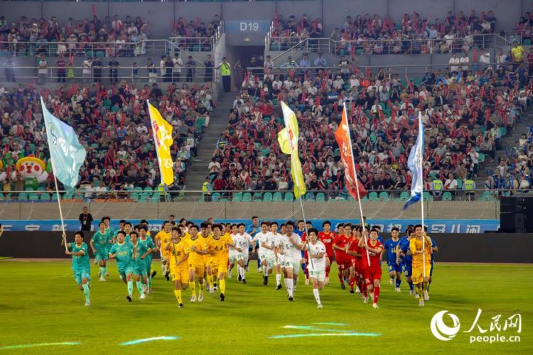 球员举旗跑步入场。人民网 林铭贤摄