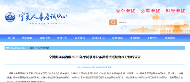 宁夏2026年考试录用公务员笔试成绩合格分数线公布