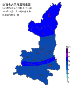 此外,主要降温时段陕北在18日夜间到19日,关中及陕南在19日至21日,过程期间日平均气温全省大部下降10~12℃,陕北北部、秦岭山区局地14℃以上。寒潮大风预报:
