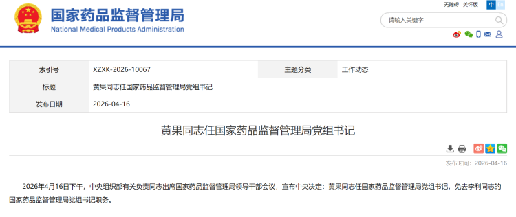 2026年4月16日下午,中央组织部有关负责同志出席国家药品监督管理局领导干部会议,宣布中央决定:黄果同志任国家药品监督管理局党组书记,免去李利同志的国家药品监督管理局党组书记职务。
