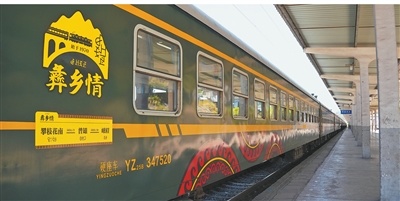 往返普雄和攀枝花间,全程近10小时,沿途25个车站逢站必停,最低票价2元,当地人亲切地称这趟列车为“小慢车”。它穿行于崇山间,掠过一座座彝族村寨,车身绿色涂装上,“彝乡情”三个字格外醒目。