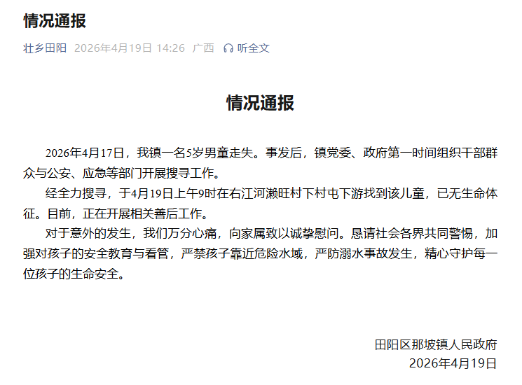 经全力搜寻,于4月19日上午9时在右江河濑旺村下村屯下游找到该儿童,已无生命体征。目前,正在开展相关善后工作。