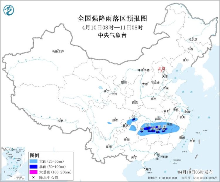 预计,4月10日08时至11日08时,湖北南部、湖南中北部、江西中北部、福建西北部、重庆中部、贵州东北部、四川中部等地部分地区有大到暴雨,其中,湖南中部等地部分地区有大暴雨(100~110毫米)。上述部分地区伴有短时强降水(最大小时降雨量20~40毫米,局地可超过50毫米),局地有雷暴大风或冰雹等强对流天气。