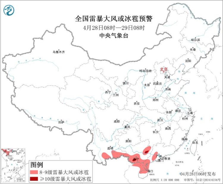预计4月28日08时至29日08时,华南中西部、西南地区南部等地的部分地区将有8级以上雷暴大风或冰雹天气,其中,广西东部和南部等地的部分地区将有10级以上雷暴大风,最大风力可达11级以上;华南中西部、西南地区南部等地的部分地区将有小时雨量大于20毫米的短时强降水天气,其中,广西东北部、广东中西部和南部沿海等地的部分地区小时雨量大于50毫米,最大可达60毫米以上。