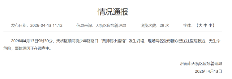 2026年4月13日9时30分,天桥区顺河街少年路路口“黄师傅小酒馆”发生坍塌,现场两名受伤群众已送往医院救治,无生命危险,事故原因正在调查中。 济南市天桥区应急管理局 2026年4月13日