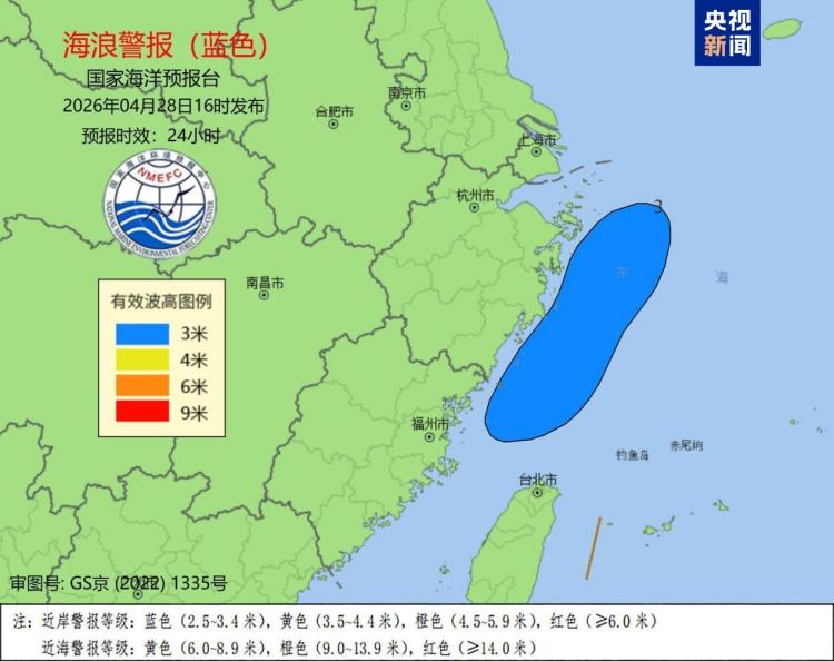 受东海低压和冷空气的共同影响,预计4月29日上午到下午,东海南部将出现2.5到3.8米的大浪区;浙江近岸海域将出现1.8到2.8米的中浪到大浪,近岸海域海浪预警级别为蓝色。