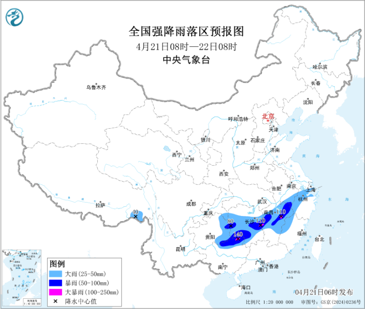 预计,4月21日8时至22日8时,重庆东南部、贵州东部、湖南中南部、江西中北部、安徽南部、浙江西部和北部、上海南部、广西东北部等地部分地区有大到暴雨,其中,湖南中部、江西中部、广西东北部等地局地有大暴雨(100~140毫米)。上述部分地区伴有短时强降水(最大小时降雨量20~40毫米,局地可超过50毫米),局地有雷暴大风或冰雹等强对流天气。