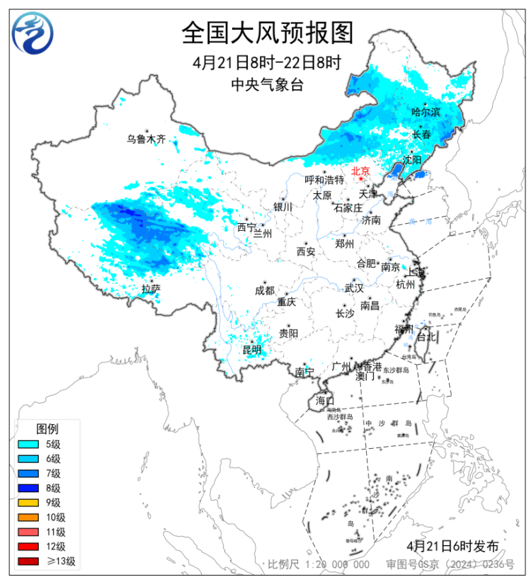 预计,4月21日8时至22日8时,内蒙古中东部、黑龙江中南部、吉林、辽宁以及新疆南疆盆地、西藏北部、青海西部等地部分地区有5~7级风,阵风8~9级,渤海北部海域、黄海北部海域将有7级、阵风8级的风。