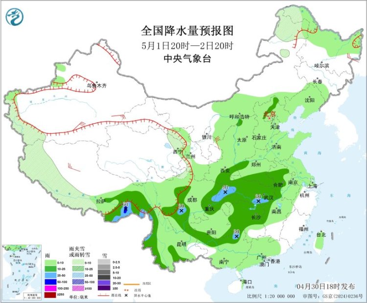 图1 全国降水量预报图(4月30日20时-5月1日20时)