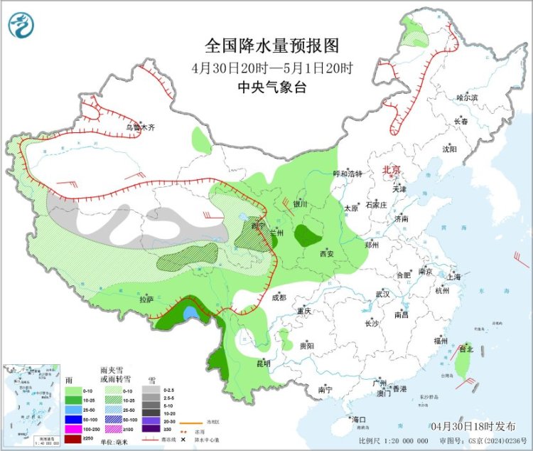 4月30日20时至5月1日20时,西藏北部和西部、青海等地部分地区有小雪或雨夹雪。内蒙古西部、甘肃大部、宁夏、陕西、川西高原北部、云南中西部、西藏东部、台湾岛等地部分地区有小到中雨,其中,西藏东南部局地有大雨。新疆东部、内蒙古西部、甘肃、青海、西藏东北部、云南北部等地部分地区仍有4~6级风,阵风7~9级,新疆东部局地阵风可达10级以上(见图1)。