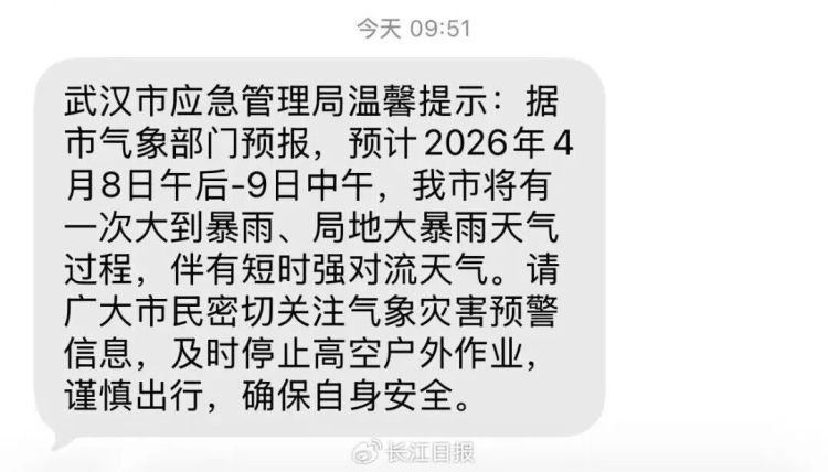 4月8日,武汉市应急管理局发布温馨提示:据市气象部门预报,预计2026年4月8日午后至9日中午,我市将有一次大到暴雨、局地大暴雨天气过程,伴有短时强对流天气。请广大市民密切关注气象灾害预警信息,及时停止高空户外作业,谨慎出行,确保自身安全。