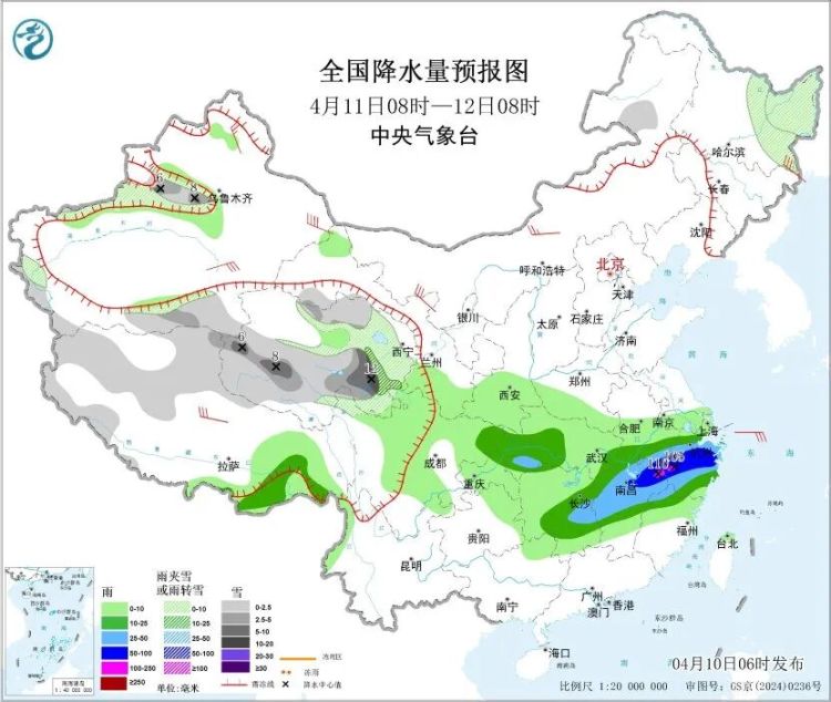 预计,4月10日14时至11日14时,湖南中北部、湖北东南部、江西中北部、安徽南部、浙江中西部及重庆东部、贵州东部等地部分地区有大到暴雨,其中,湖南中部等地局地有大暴雨。上述部分地区伴有短时强降水,局地有雷暴大风或冰雹等强对流天气。