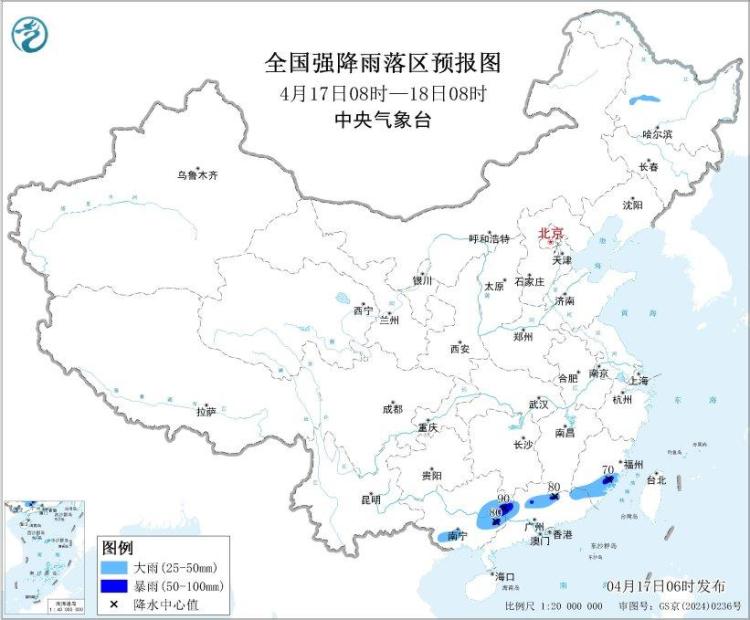 预计,4月17日08时至18日08时,广西东部和南部、广东中北部、福建东南部等地部分地区有大雨,其中,广西东部、广东北部、福建东南部等地部分地区有暴雨(50~90毫米)。上述部分地区伴有短时强降水(最大小时降雨量20~40毫米,局地可超过50毫米),局地有雷暴大风或冰雹等强对流天气。
