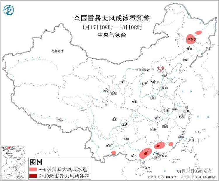 预计4月17日08时至18日08时,华南和东北地区中部等地的部分地区将有8级以上雷暴大风或冰雹天气,其中,广西东南部和广东北部等地的部分地区将有10级以上雷暴大风;华南等地的部分地区将有小时雨量大于20毫米的短时强降水天气,其中,广东北部部分地区小时雨量大于50毫米。