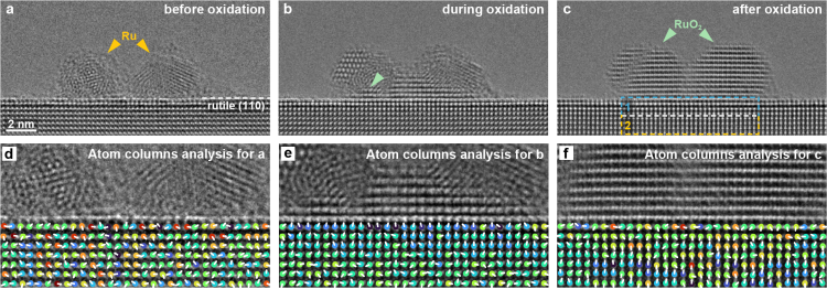 本工作中,研究团队聚焦于高性能负载型Ru(钌)基催化剂的研发,利用原子分辨环境透射电镜,从原子尺度原位解析了金红石型二氧化钛中Ru单颗粒的氧化机制,并首次在该过程中观测到体相氧溢流,证实了载体中的晶格氧以空位介导的方式通过界面输运至金属颗粒。