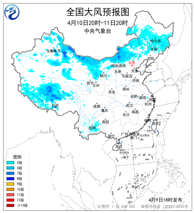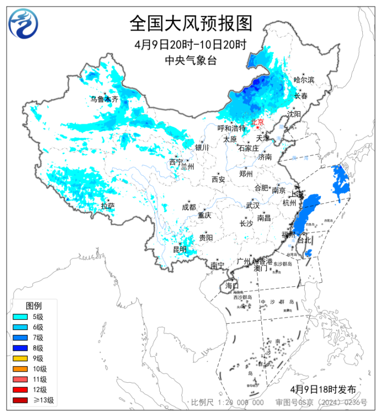 预计,4月9日20时至10日20时,新疆东部、甘肃中西部、青海北部、内蒙古中东部、吉林西部、辽宁西部、河北北部、山东东部、西藏中南部、四川西部、云南东部等地部分地区有5~7级风,阵风8~9级,内蒙古东部局地阵风10级以上;东海北部和西南部海域有7级风、阵风8级。