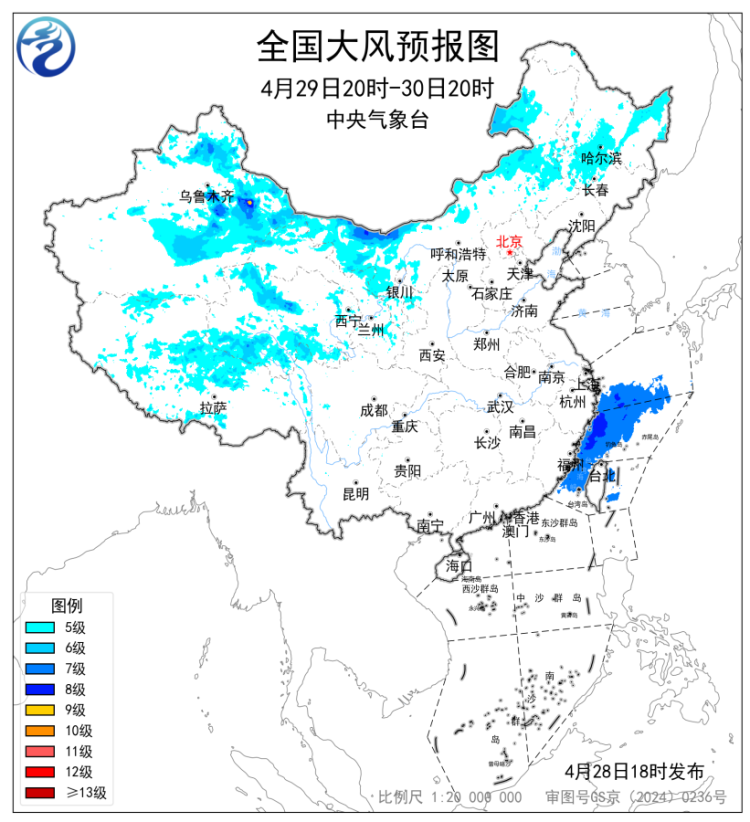 预计,4月29日20时至30日20时,新疆北部和东部、内蒙古西部和东部、东北地区西部、青海中南部、西藏北部等地部分地区有5~6级风,阵风7~8级,其中,新疆北部、内蒙古西部等地部分地区风力可达7~8级,阵风9~10级。东海大部海域、浙江南部沿岸海域、福建沿岸海域、台湾海峡将有7~8级、阵风9~10级的大风。